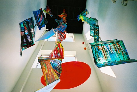 The sculpture consists of roughly fourteen pieces of hand formed acrylic painted with colored resin including a four foot, blue square and a four foot, red circle. The sculpture is suspended at three stories high. This view is taken from ground level looking up at the sculpture. It is meant to replicate the look of blown glass.
