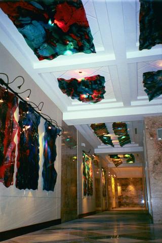 Two years after this photo was taken, the decision to remove the pieces on the ceiling to allow for more light changed the entire look and feel of the original concept and does not convey the artist's intentions but the remaining pieces on the wall are still works of art in their own right.